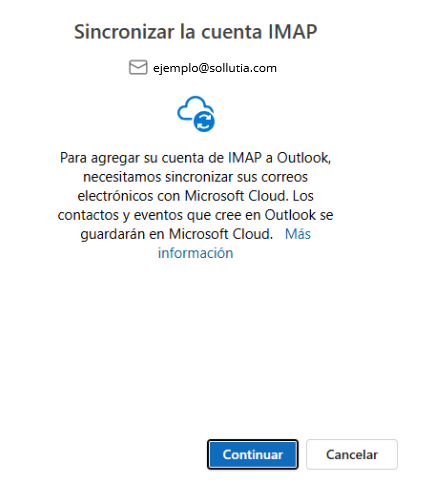 4. Sincronització de compter IMAP amb Outlook. Simplement et diu que es sincronitzará per a que es guarde en Microsoft Cloud. Apretem Continuar