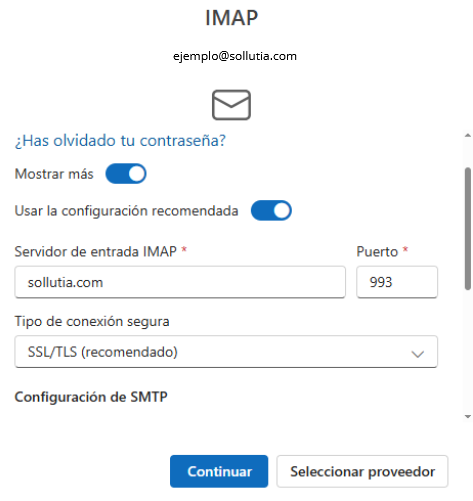 4. Sincronización de cuenta IMAP con Outlook. Simplemente te dice que se sincronizará para que se guarde en Microsoft Cloud. Apretamos Continuar.